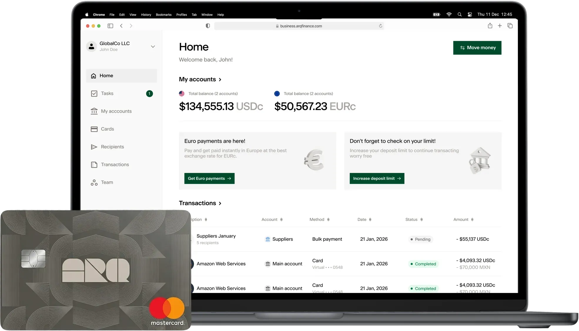 Automate payouts to international suppliers and contractors across the USA, Europe and Latin America, directly from your ARQ Business account.
